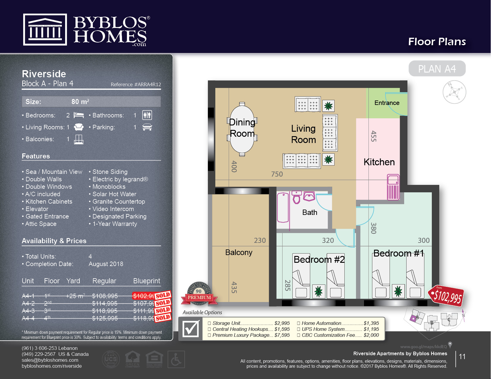 Located on an incline, Riverside Apartments offers spectacular view of the Mediterranean Sea, little traffic and convenience – less than 10 seconds from the freeway. Underground parking, private entrance and large balconies are just few of the amenities available. With 11 floor plans to choose from, you can select the right size and budget to fit your needs. Sizes vary from 80 to 135 square meters for 2 to 3 bedrooms, and pre-construction prices start at $99,995, making your next house very affordable.