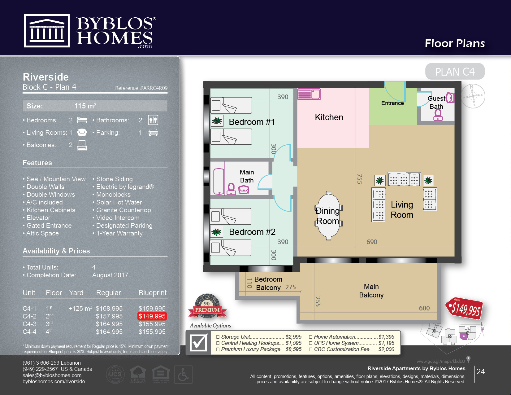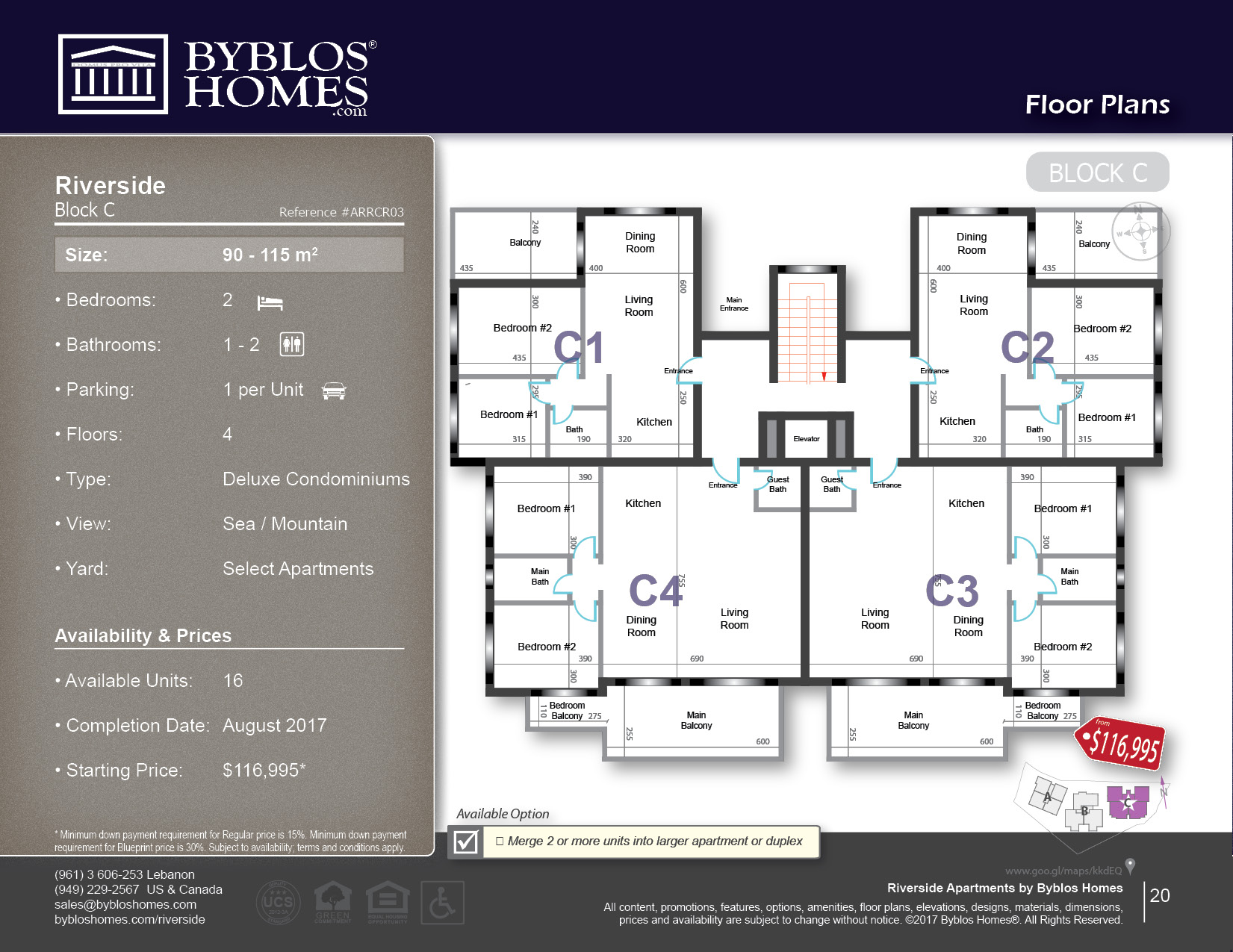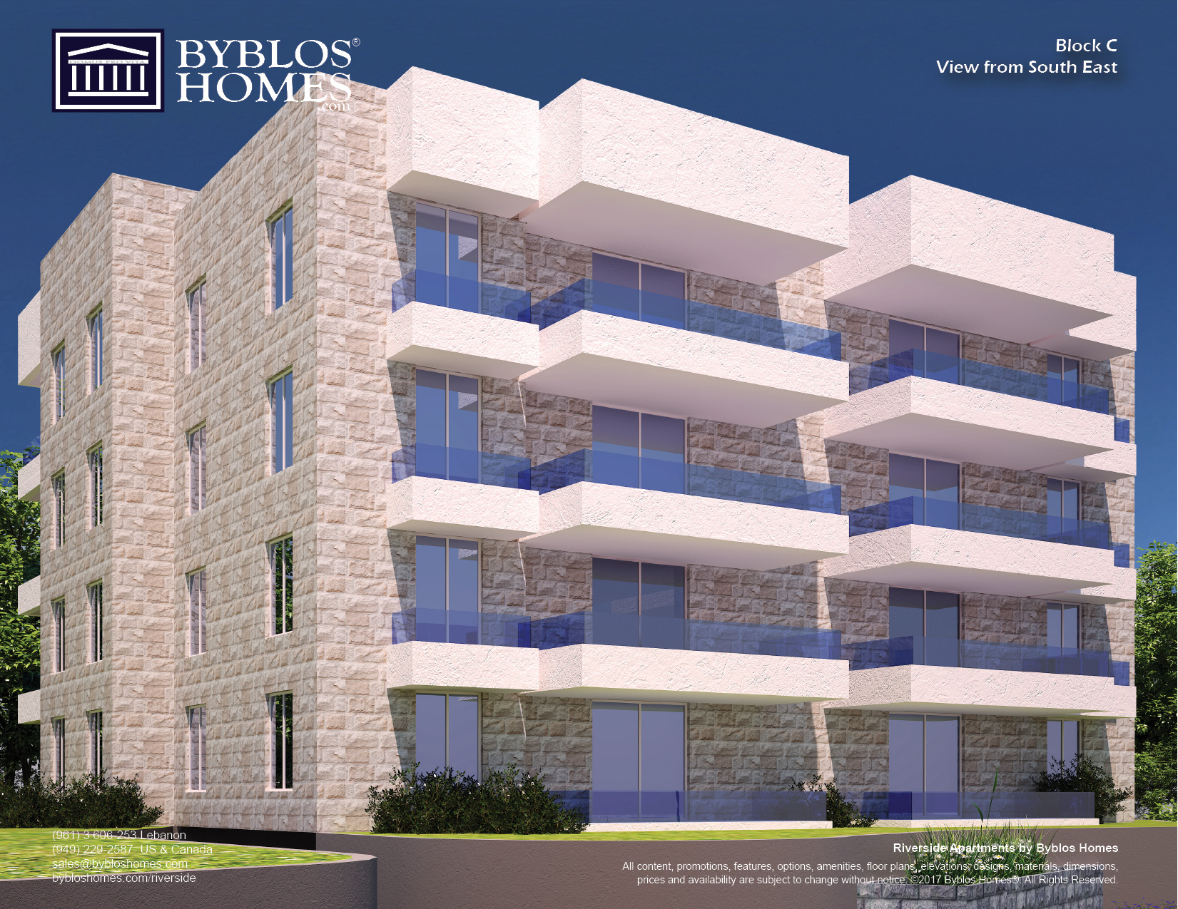 Description Located on an incline, Riverside Apartments offers spectacular view of the Mediterranean Sea, little traffic and convenience – less than 10 seconds from the freeway. Underground parking, private entrance and large balconies are just few of the amenities available. With 11 floor plans to choose from, you can select the right size and budget to fit your needs. Sizes vary from 80 to 135 square meters for 2 to 3 bedrooms, and pre-construction prices start at $99,995, making your next house very affordable. |